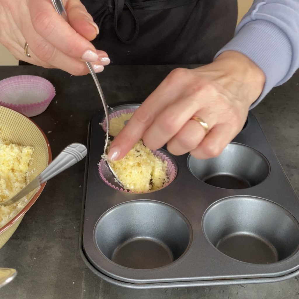 compactez bien avec le dos d’une cuillère à café et puis ajoutez-en encore pour compléter la caissette, toujours en compactant bien, sinon une fois cuite, elle ne sera pas bien compacte.