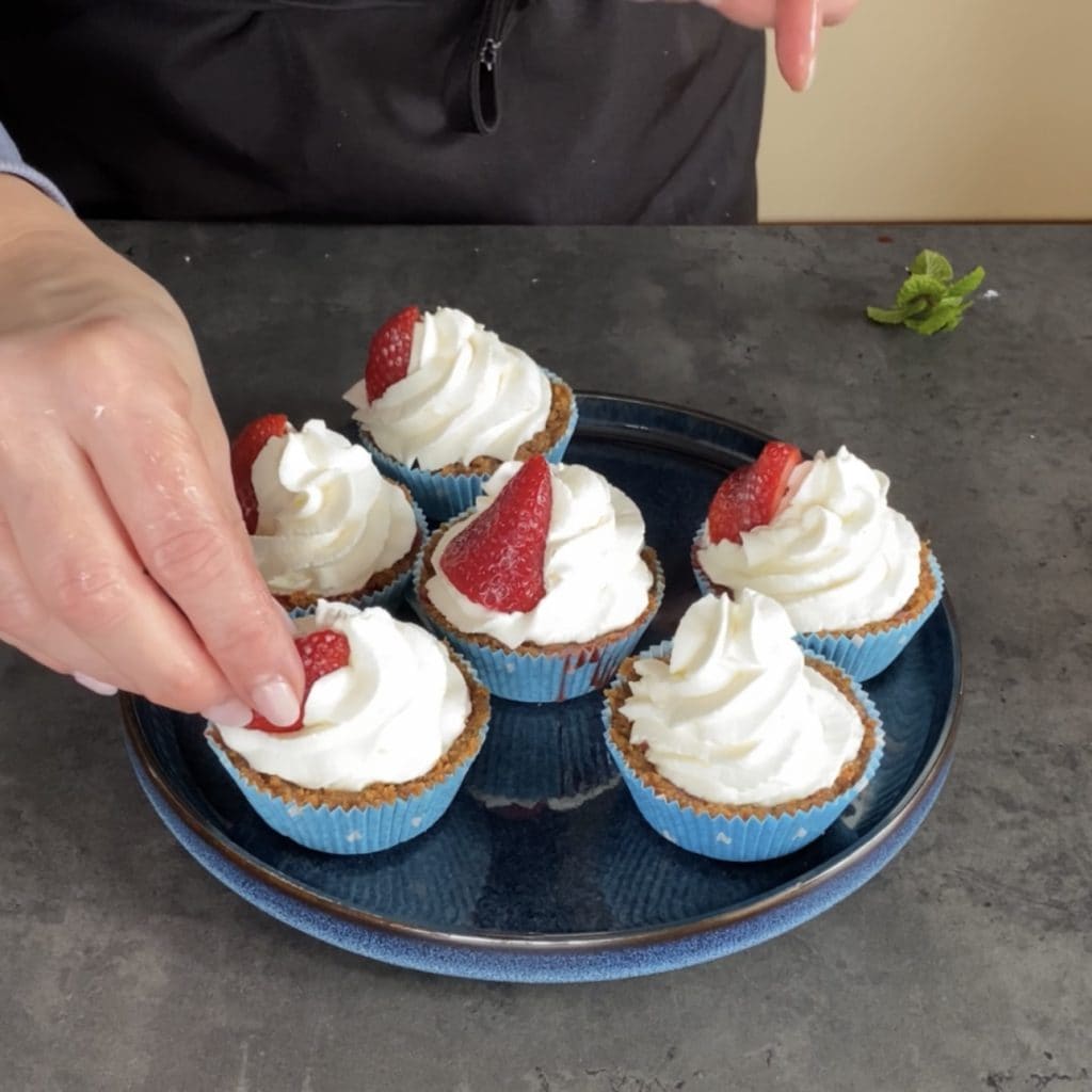 Petits gâteaux aux fraises un délicieux dessert, facile à réaliser avec un cœur fondant aux fraises. Ces petits gâteaux aux fraises sont une sorte de cupcake aux fraises, avec une touche de crème fouettée qui rappelle le sommet des cupcakes mais avec une croûte de biscuit et un cœur liquide fait avec la coulis de fraises. Si vous le souhaitez, vous pouvez aussi les faire avec des framboises et suivre la recette de la COULIS DE FRAMBOISE. Si comme moi vous aimez les fraises, je vous conseille de regarder d’autres recettes de Desserts avec des fraises. Passons maintenant à la préparation des petits gâteaux aux fraises et si vous les essayez, faites-le moi savoir. Barbara