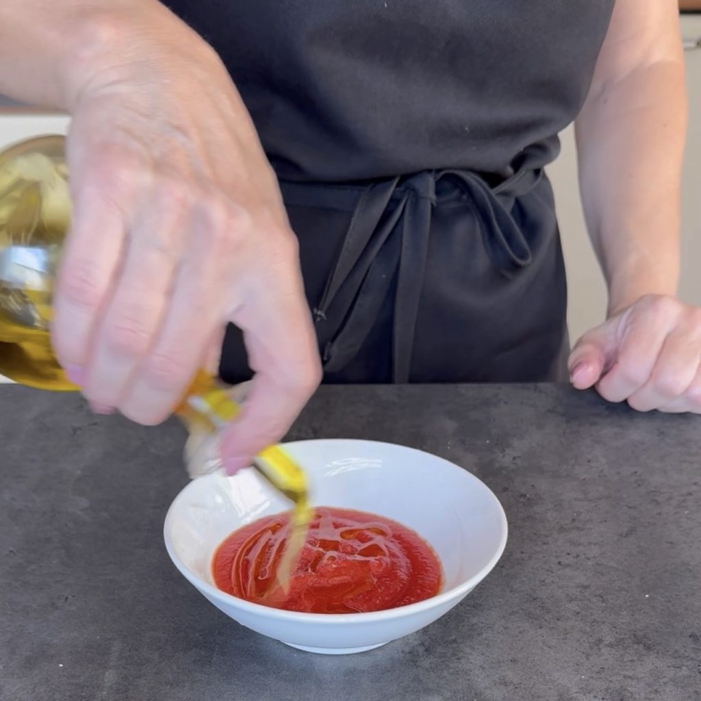 Versez le coulis de tomate dans un petit bol, ajoutez du sel,