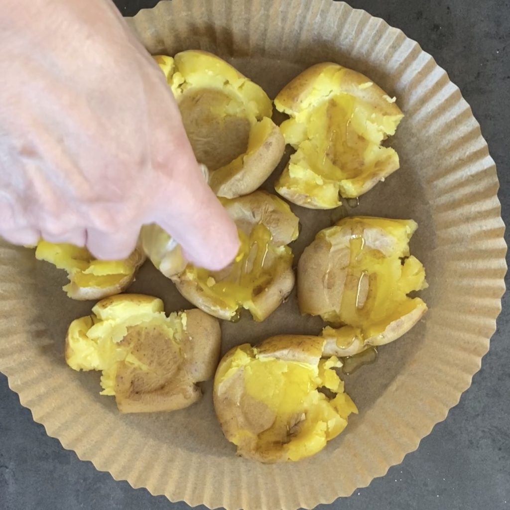 Lorsque les pommes de terre sont cuites, retirez-les de l’eau et placez-les sur un plateau, avec une petite tasse ou un petit verre, écrasez-les au centre.