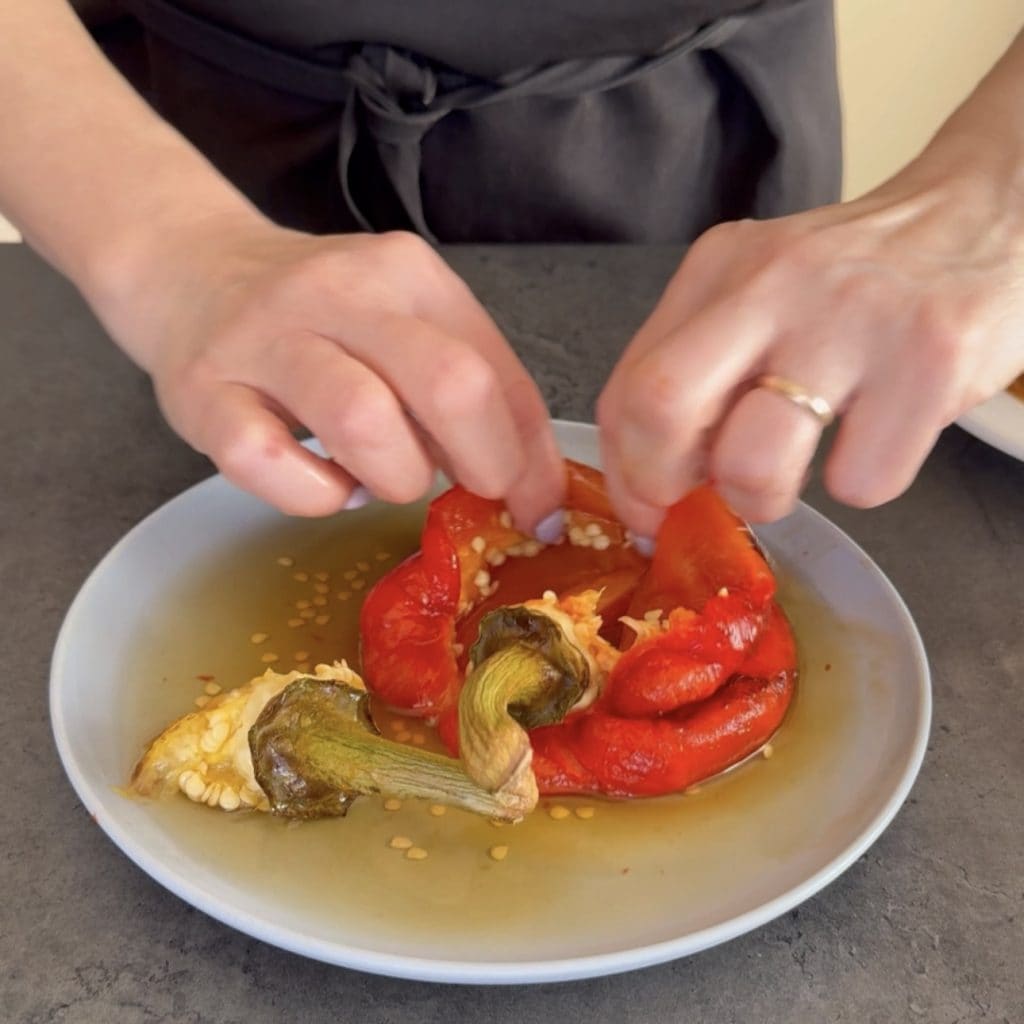 Quand ils seront prêts, éteignez la friteuse et laissez-les reposer dans le panier de la friteuse pendant 15/20 minutes. Grâce à cette étape, les poivrons pourront être pelés facilement. Si vous voulez les faire au four, faites chauffer le four ventilé à 180°C et quand il sera chaud, insérez les poivrons et faites-les cuire pendant environ 40 minutes, puis placez-les encore chauds dans un sac alimentaire, fermez-le et laissez reposer pendant 10 minutes. Une fois que vous avez cuit les poivrons, pelez-les,