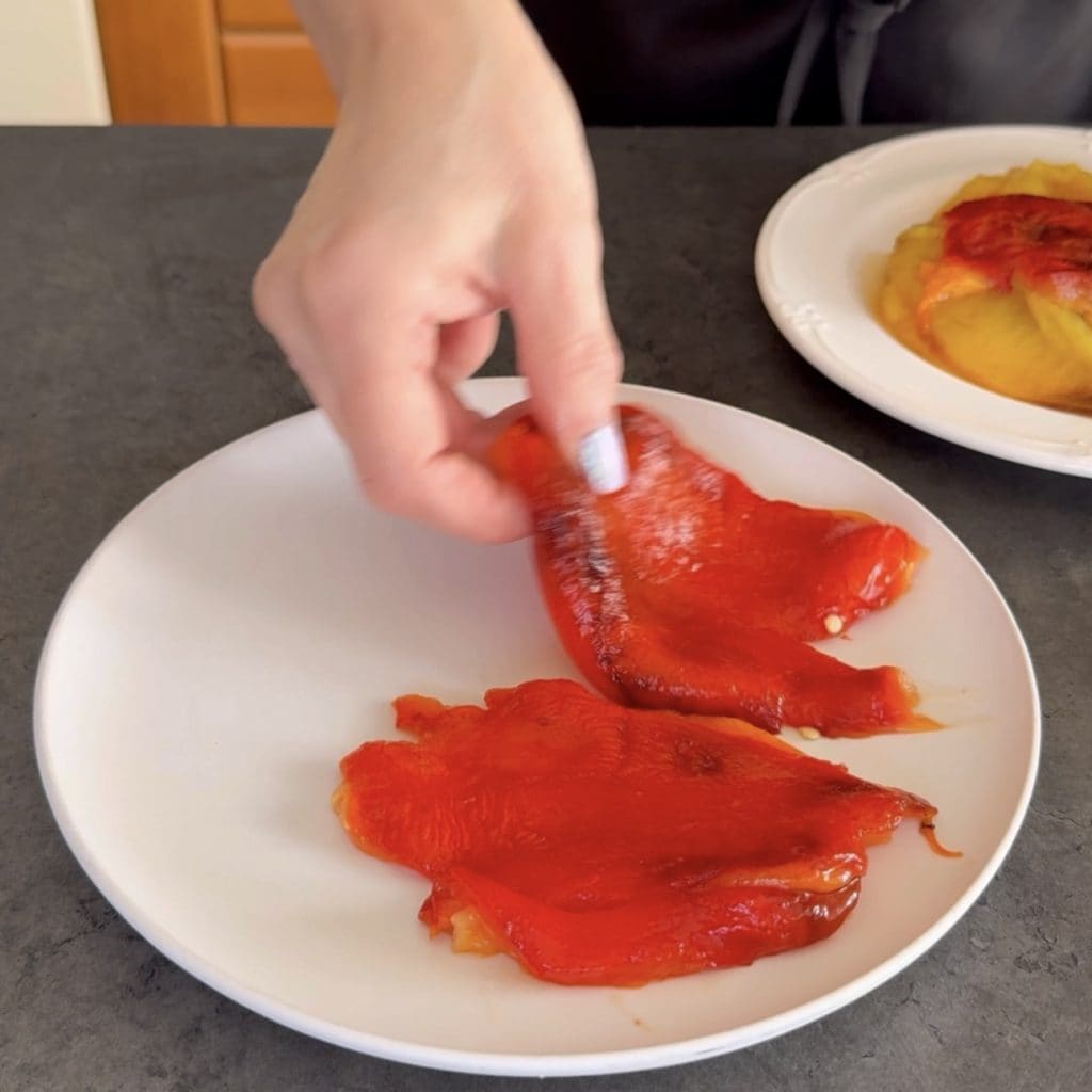 • ensuite, disposez les filets de poivron dans une assiette.
