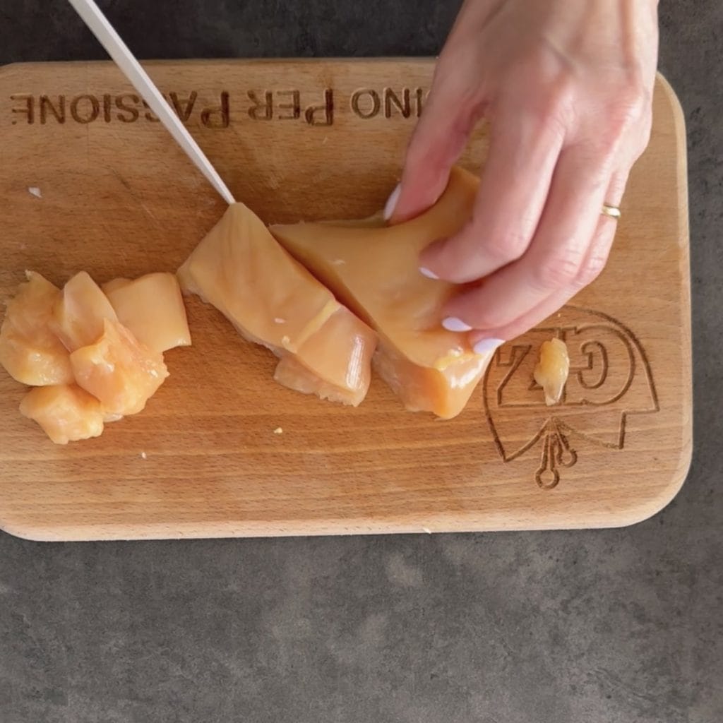 Éliminez du blanc de poulet les éventuels petits os et parties grasses, coupez-le en morceaux pas trop gros.