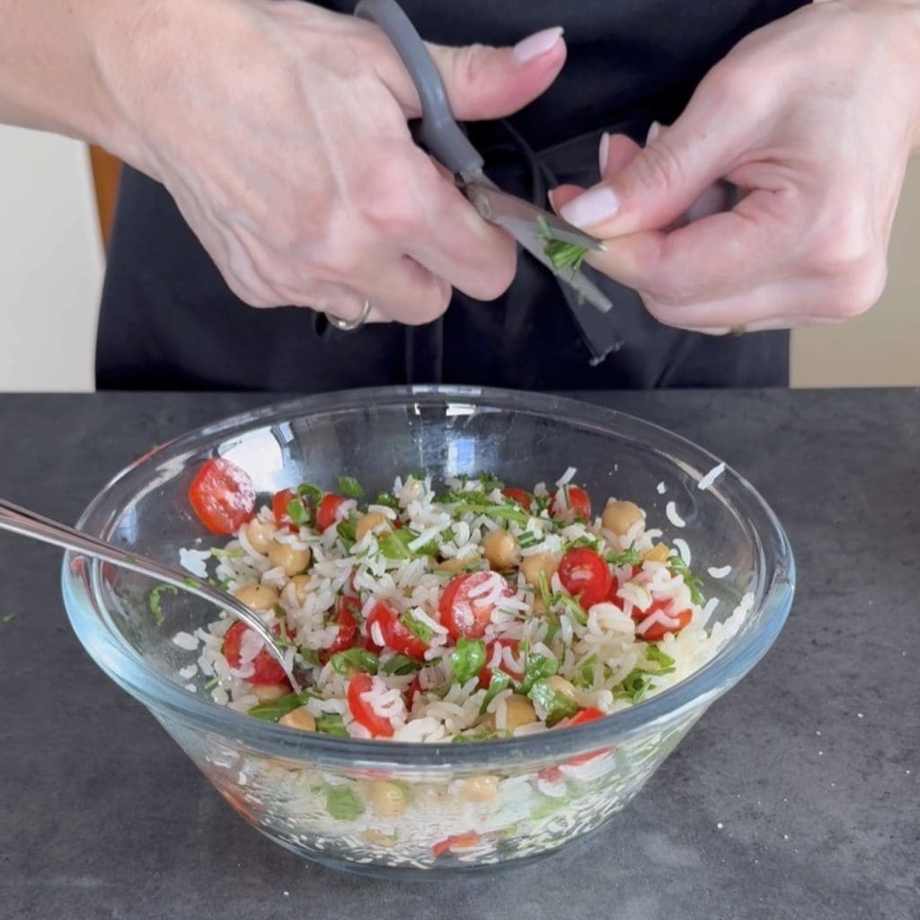 • Servez la salade de riz avec pois chiches et tomates cerises et si vous le souhaitez, vous pouvez ajouter plus de ciboulette dans l’assiette.
