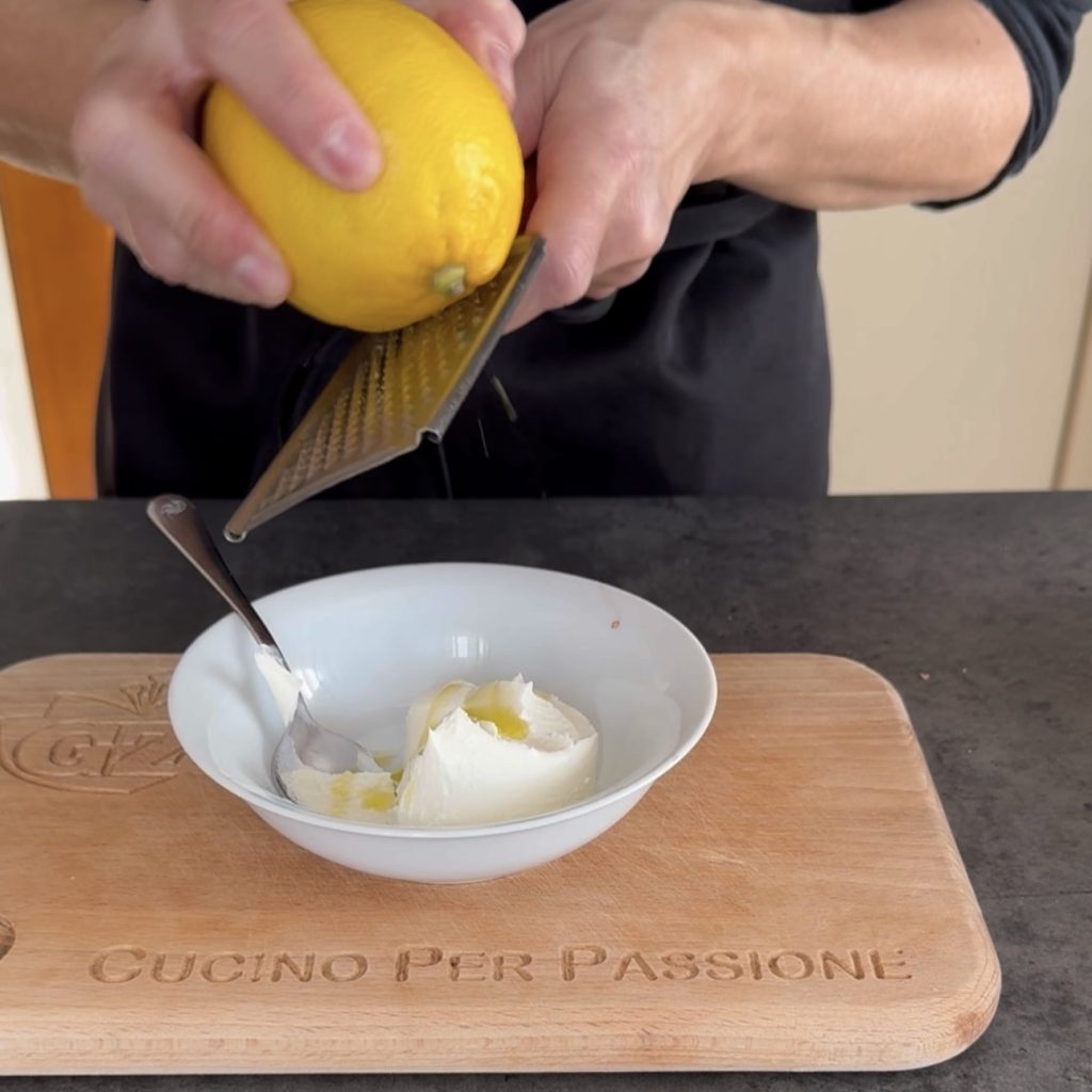 Nous allons commencer à préparer les Roses de saumon, une entrée sans cuisson, versez le fromage dans un petit bol, ajoutez l’huile d’olive extra vierge,