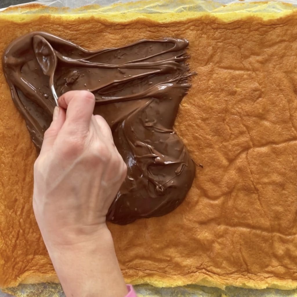 Quand la pâte biscuitée est froide, déroulez-la, ajoutez abondamment de la nutella sur toute la surface et enroulez à nouveau, au fur et à mesure que vous enroulez, retirez le papier sulfurisé.