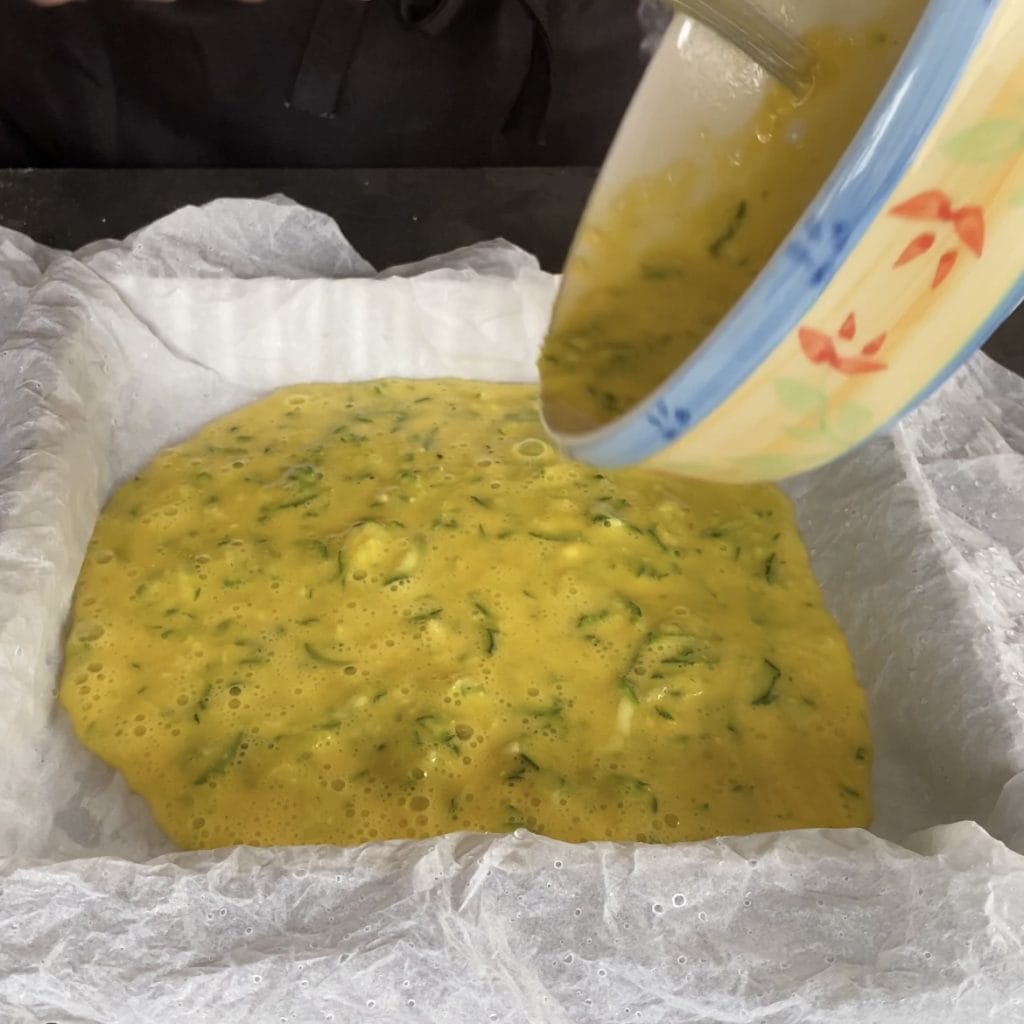 recouvrez de papier cuisson un moule, le mien est carré et mesure environ 21 centimètres. Faites cuire l’omelette dans un four statique déjà chaud à 180°C pendant 10 minutes.