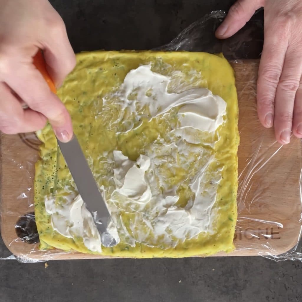 Entre-temps, coupez la mozzarella en tranches et laissez-la reposer pour qu’elle perde son liquide, coupez également la tomate en tranches. Quand le rouleau d’omelette aux courgettes sera froid, reprenez-le, retournez-le, déroulez-le, enlevez le papier cuisson et étalez du fromage à tartiner,