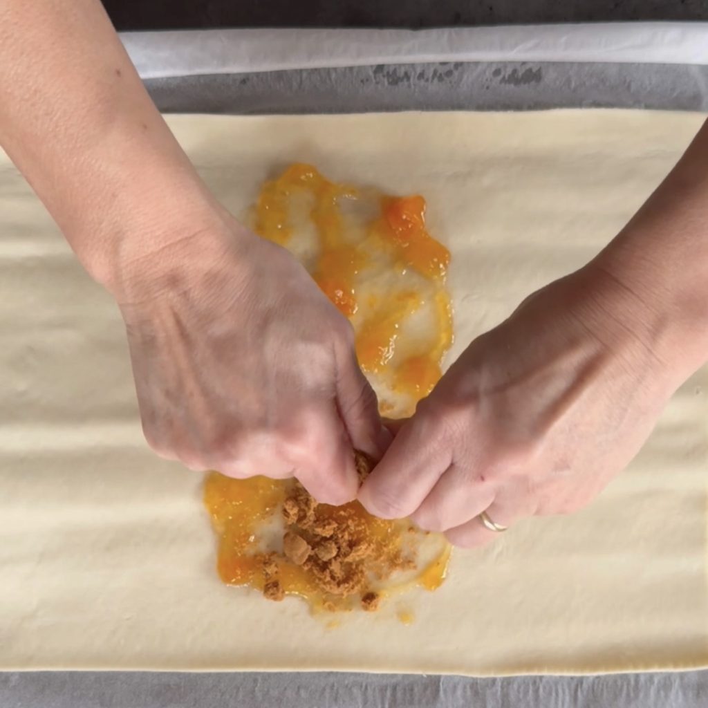 Déroulez la pâte feuilletée, placez le côté le plus long devant vous et mettez au centre de la confiture que vous allez ensuite étaler,