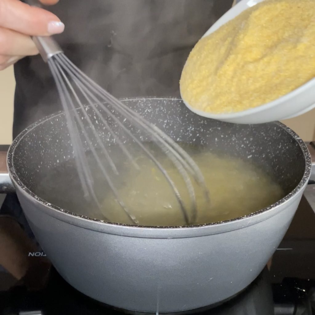 Quand la chicorée est prête, préparez la polenta, versez l’eau dans une casserole, et quand elle bout, ajoutez le sel,