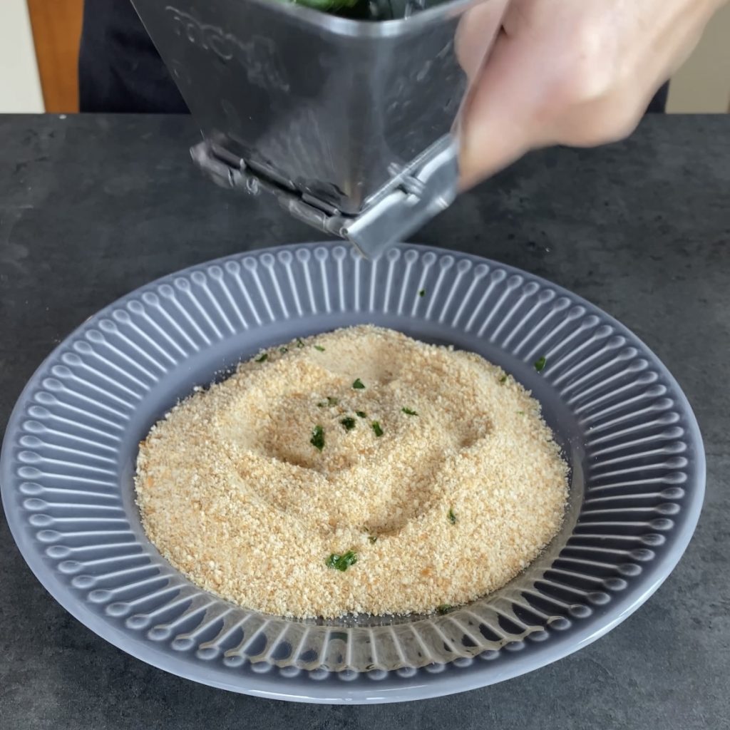 Commençons à préparer les Roulés de capocollo, versez dans une assiette la chapelure, ajoutez du persil haché,