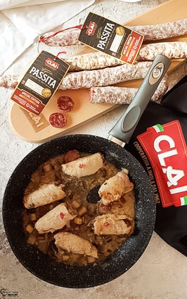 Roulés de viande au radicchio et saucisse Passita CLAI sont délicieux et tendres, et par ailleurs très faciles à réaliser. Pour préparer ces délicieux roulés, je vous conseille d’utiliser du radicchio tardif de Trévise, qui a un goût plus doux et délicat par rapport au précoce qui est plus amer. Pour préparer ces roulés farcis, j’ai utilisé la saucisse Passita CLAI, un salami fin unique en son genre, fabriqué selon la recette ancienne avec les meilleures viandes maigres de porcs nés et élevés en Italie. C’est la typique saucisse de Romagne, au goût doux et délicat, ensachée dans un boyau naturel. Elle est sans gluten avec l’ajout de l’épi barré, sans lait et dérivés, avec ajout de sel iodé. Vous pouvez trouver les produits Clai dans les magasins Clai, chez leurs revendeurs, et en plus, vous pouvez les trouver sur Amazon Mix Salami « Profumo di Romagna » – Travaillés à la main – Viande 100% italienne – CLAI