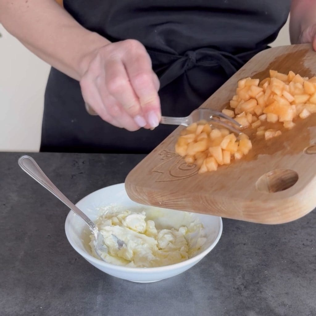 • Prenez une tranche de jambon cru, ajoutez la crème de fromage et melon