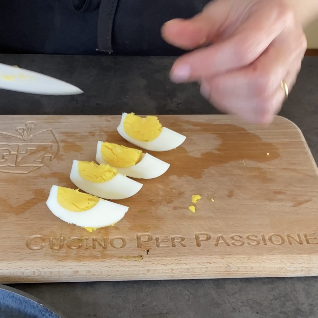 Épluchez les œufs et coupez-les en quartiers ou en tranches comme vous le préférez.