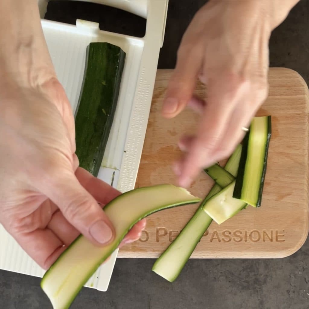 Lavez bien les courgettes, puis coupez-les finement à l’aide d’une mandoline ou d’un couteau.