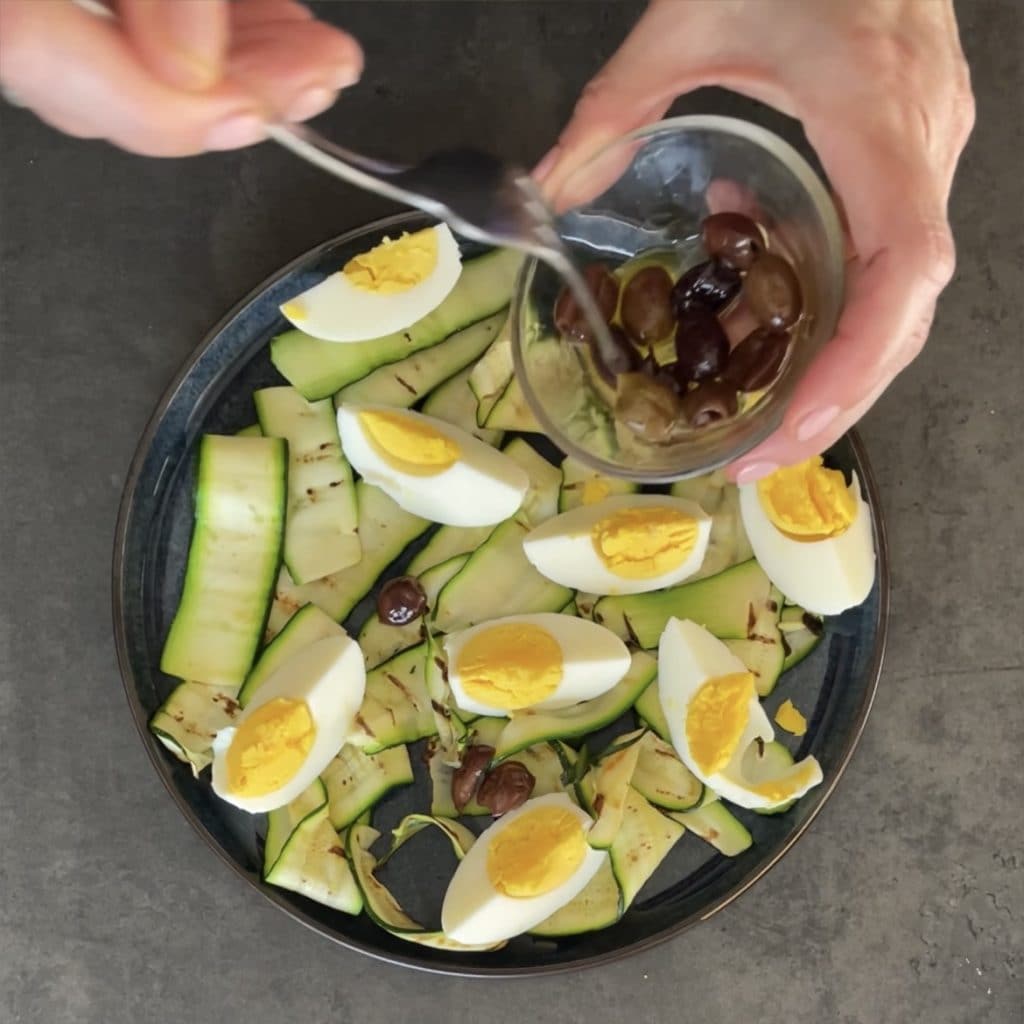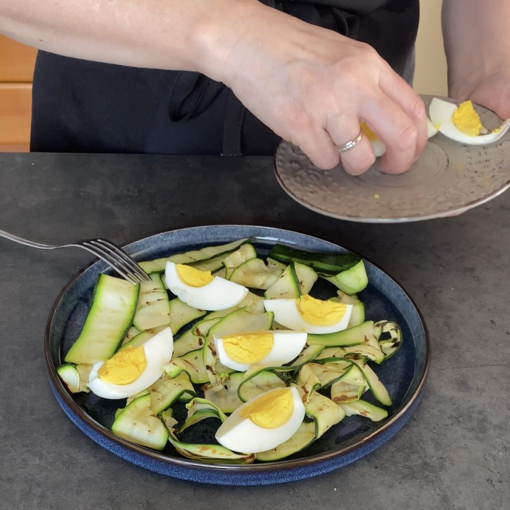 Laissez reposer au réfrigérateur pendant 30 minutes puis servez la Salade avec courgettes grillées au thon et œufs.