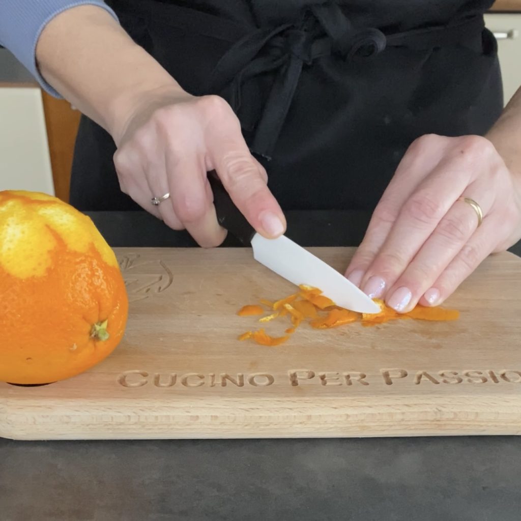 ensuite coupez l’écorce et la partie blanche en suivant la forme de l’orange.