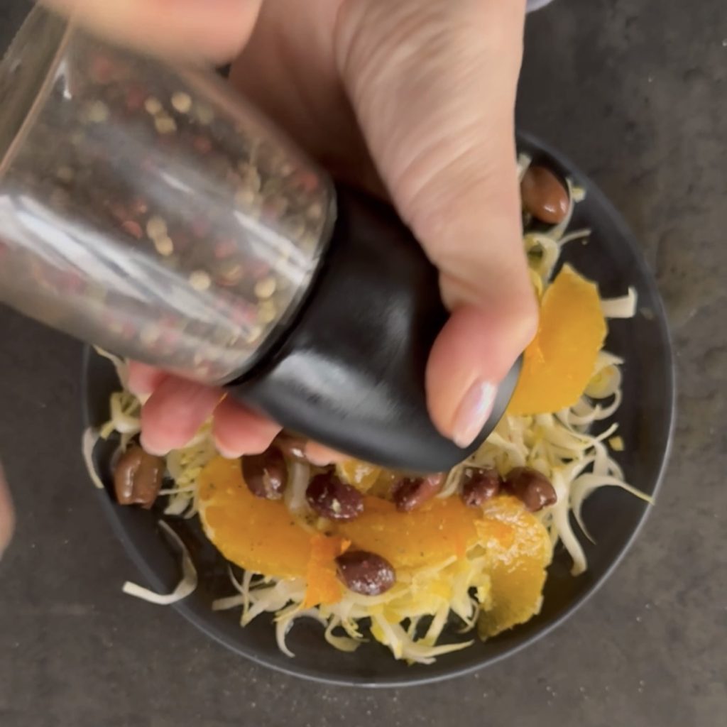 Placez ensuite les quartiers d’orange à vif sur l’endive belge,