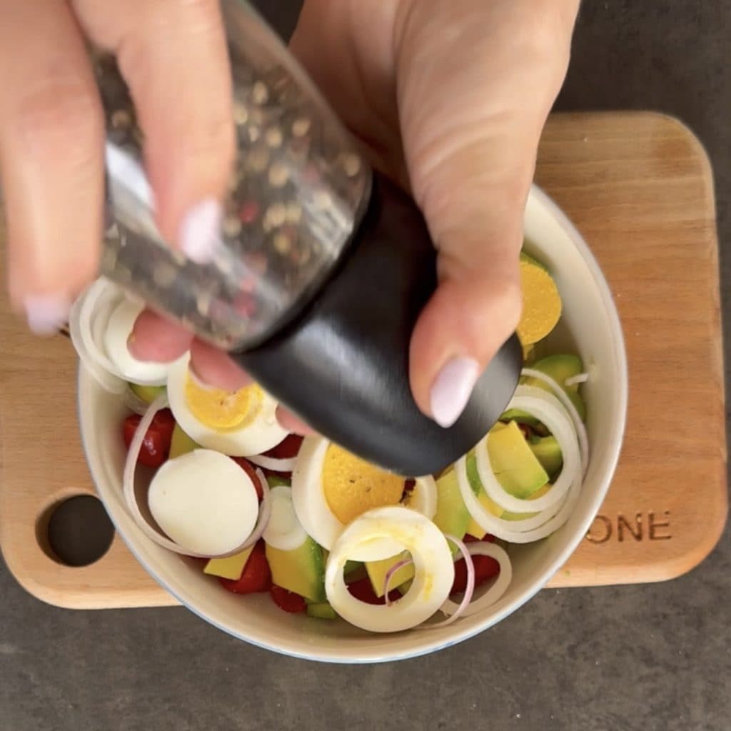 Salade de pommes de terre et œufs est un plat unique parfait pour les journées chaudes, ou un accompagnement délicieux si mangé chaud, j’adore ces plats uniques, ils sont parfaits à emporter au bureau ou à la plage. La salade de pommes de terre avec œufs durs et oignons peut aussi être préparée la veille afin d’avoir déjà tout prêt. Si vous le souhaitez, vous pouvez ajouter aussi des haricots blancs secs en les faisant tremper la nuit précédente, je les utilise souvent déjà cuits, facilement trouvables au supermarché en pot en verre. Je vous conseille de regarder les SALADES D’ÉTÉ, les SALADES DE POMMES DE TERRE, SALADES DE POIS CHICHES et aussi la SALADE DE THON. Maintenant, voyons comment faire la salade de pommes de terre et œufs et si vous l’essayez, faites-le moi savoir. Barbara