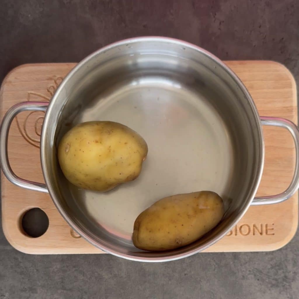 Commençons à préparer la Salade de pommes de terre et œufs, lavez les pommes de terre et faites-les cuire, soit à la vapeur, soit à la cocotte-minute. J’utilise la cocotte-minute avec le panier vapeur, je les épluche et les coupe en morceaux, je les pose dans le panier et les fais cuire 15 minutes à partir du moment où la cocotte-minute commence à siffler.