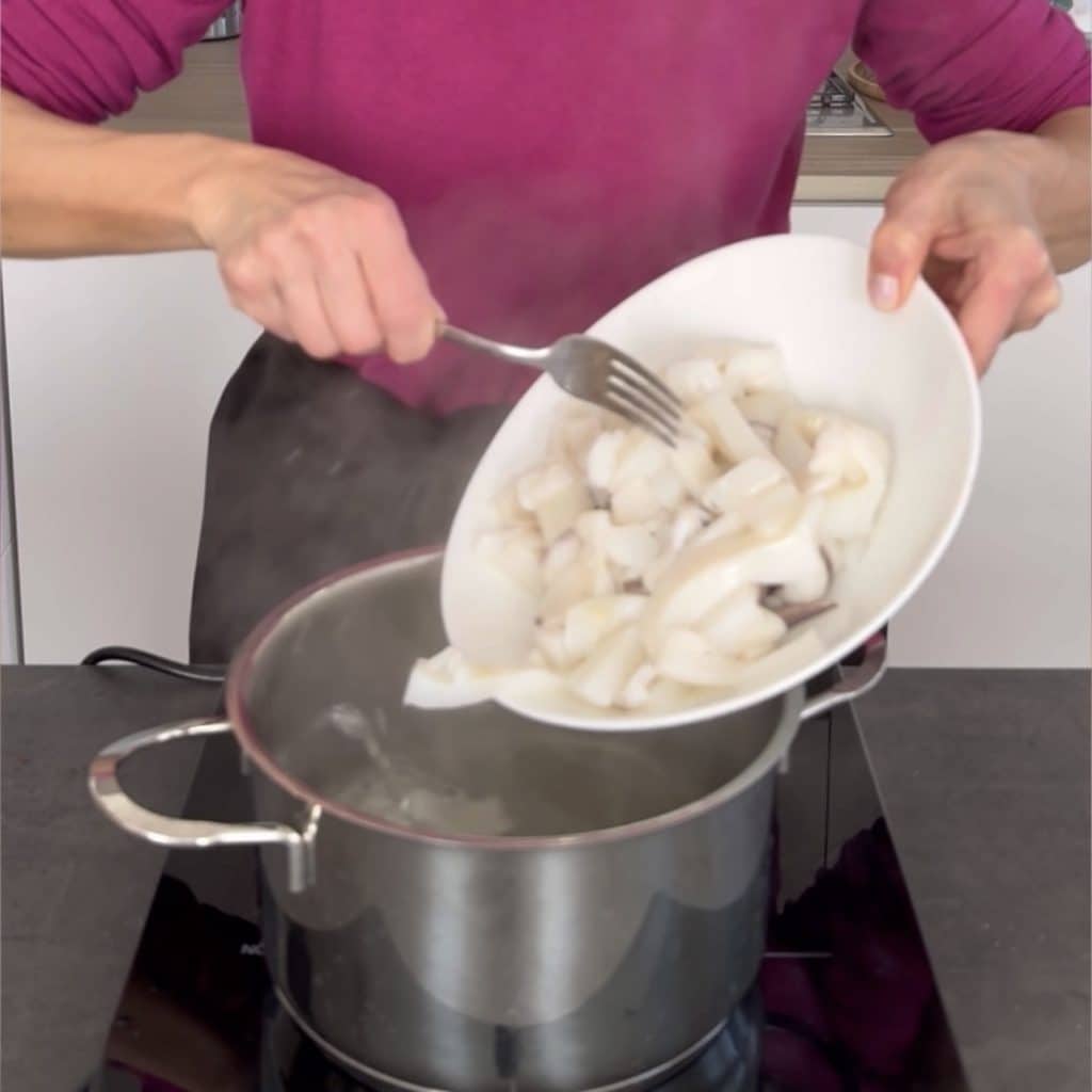 Versez dans une casserole de l’eau, mettez sur le feu et portez à ébullition, versez ensuite les morceaux de seiche et faites cuire pendant 25 minutes.