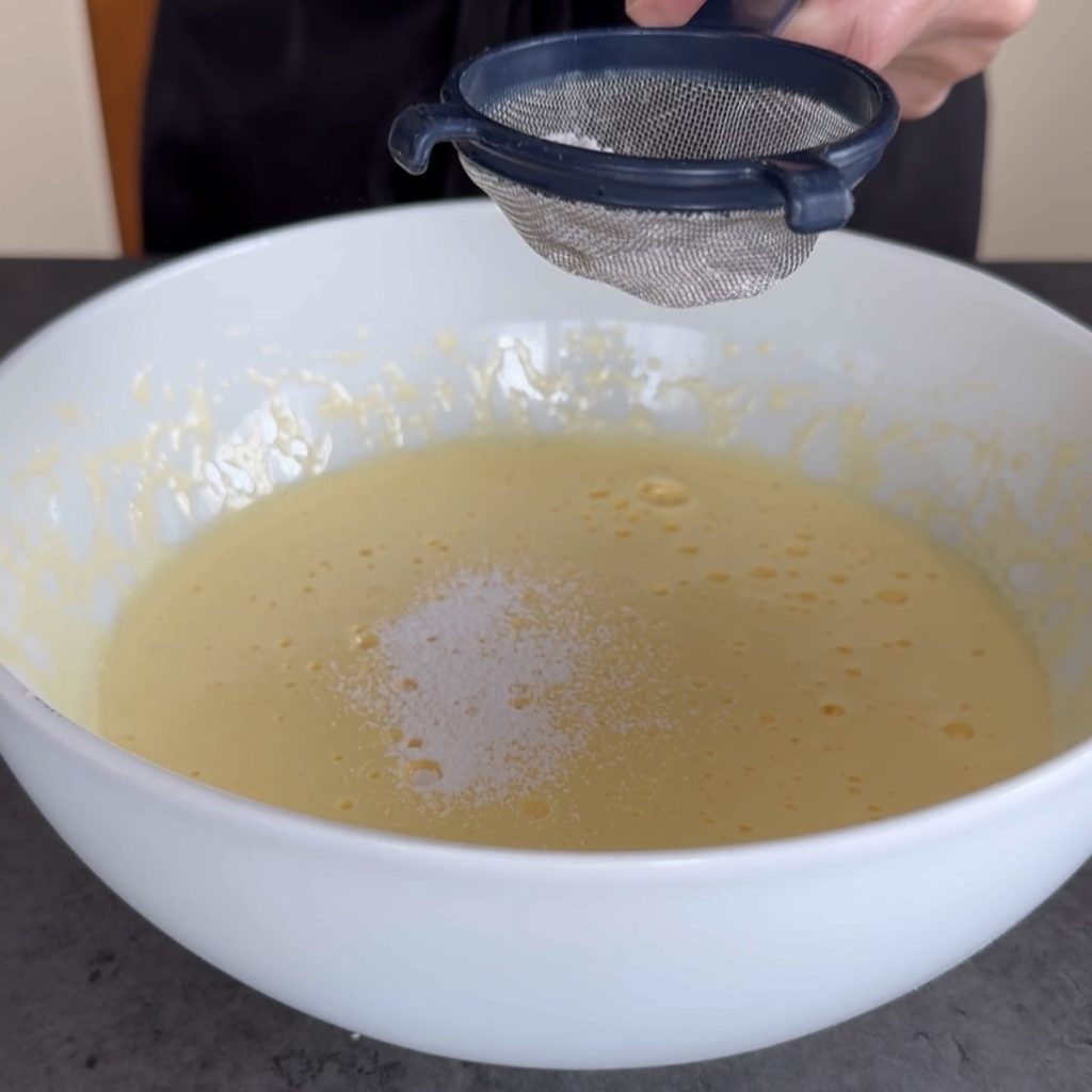 ajoutez ensuite la levure tamisée et incorporez-la aux œufs avec une spatule en effectuant des mouvements de bas en haut pour ne pas démonter le mélange.