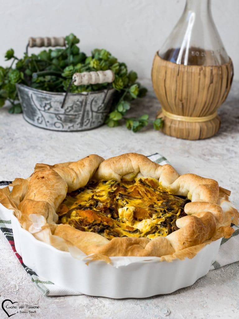 Tarte salée à la courge et aux pommes de terre une tarte salée riche et savoureuse que vous préparez facilement. Elle est excellente servie en entrée ou pour accompagner un apéritif gourmand. La tarte salée pommes de terre et courge est délicieuse chaude ou à température ambiante, parfaite donc à emporter au travail pour la pause déjeuner, ou à servir lors d’un buffet. J’ai enrichi cette tarte salée aussi avec des champignons pour qu’elle soit encore plus savoureuse, vous pouvez utiliser des champignons de Paris sautés ou un mélange de champignons. J’ai utilisé de la pâte feuilletée, vous pouvez également utiliser de la pâte brisée. Voyons maintenant comment préparer la tarte salée à la courge et aux pommes de terre, et si vous l’essayez, faites-le moi savoir. Barbara