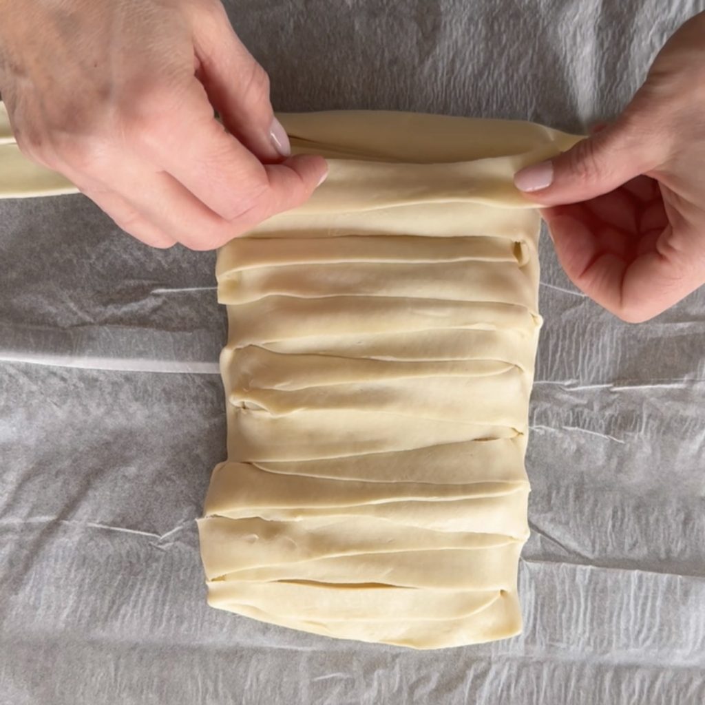 Sur les côtés de la pâte feuilletée, faites des incisions à l’aide d’un couteau bien aiguisé sur les deux côtés, créez des bandes de 1 cm, en évitant de couper la partie centrale où se trouve la garniture.