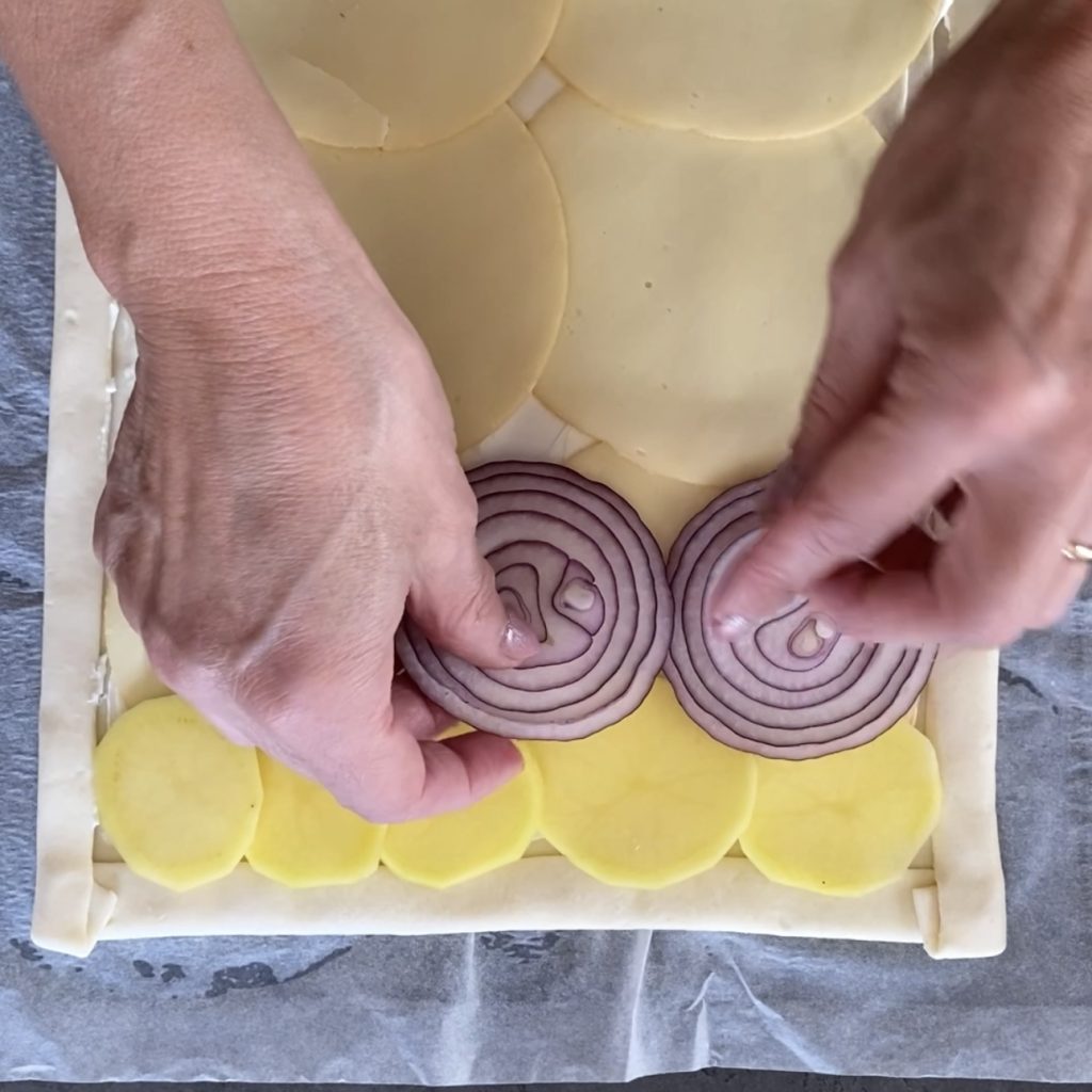 et des tranches d’oignon, en les superposant aux pommes de terre, procédez de cette manière jusqu’à compléter toute la tarte salée.