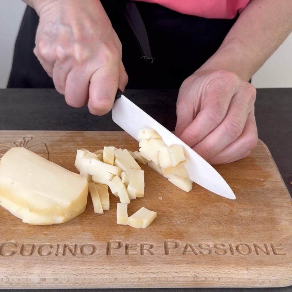 Commençons à préparer la tarte salée avec tomates cerises et scamorza, lavez les tomates cerises et coupez-les en deux,