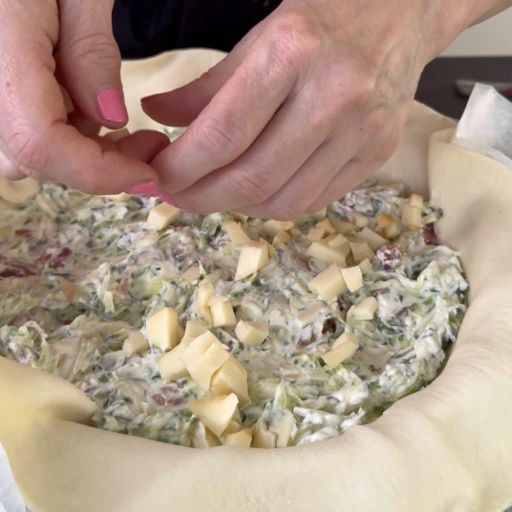 Repliez les bords de la pâte feuilletée et faites cuire dans un four statique préchauffé à 180°C pendant 30 minutes.