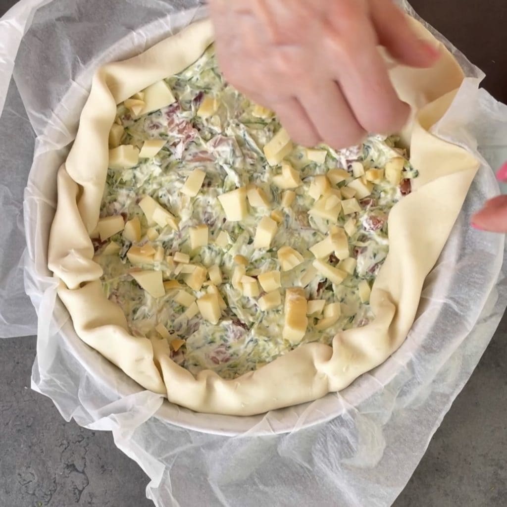 Disposez la pâte feuilletée dans le moule, versez le mélange et nivelez-le,