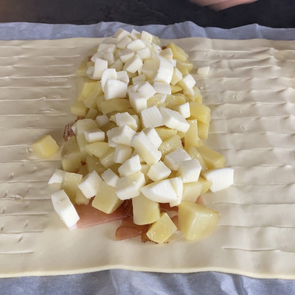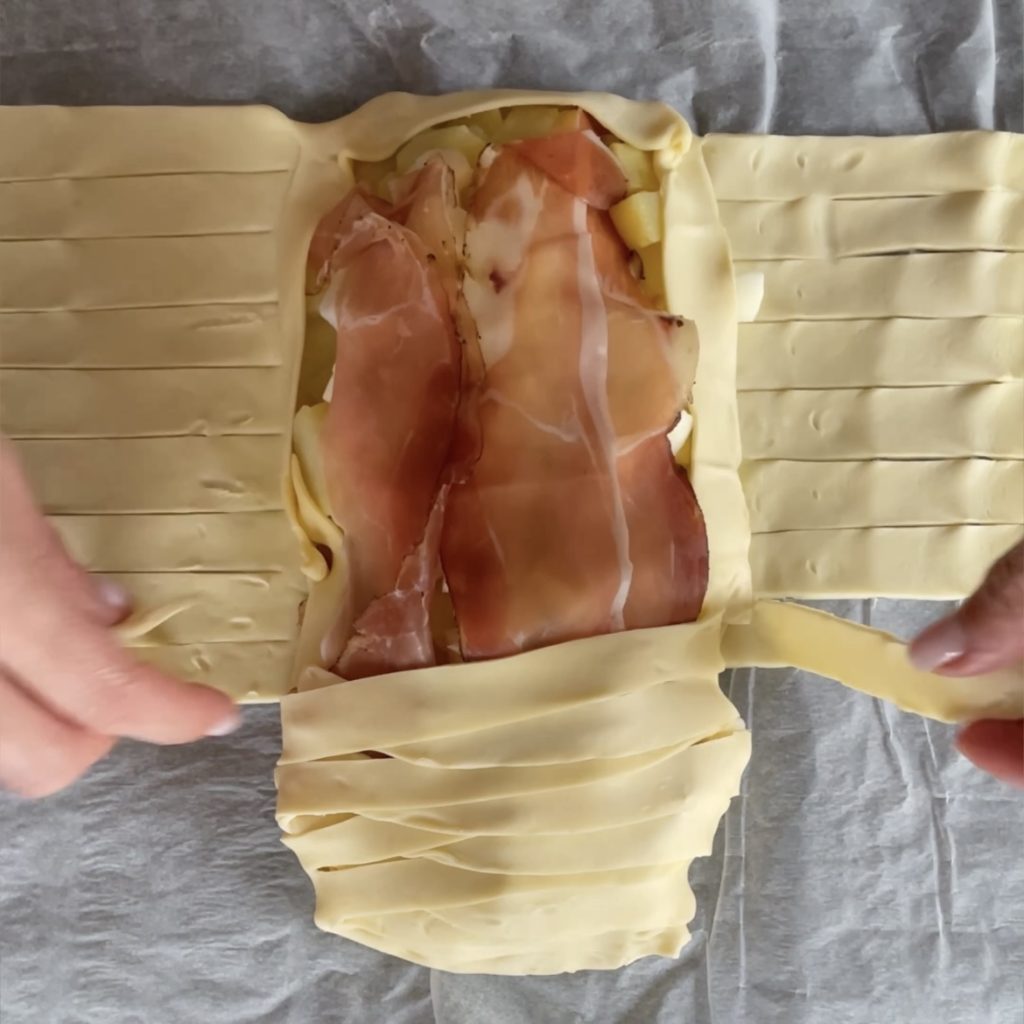 • entrelacez les lanières pour bien sceller la tarte salée speck et pommes de terre