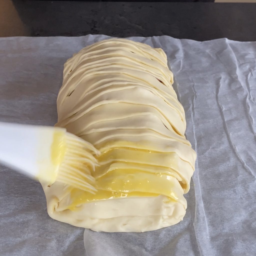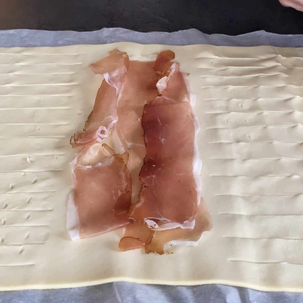 • Prenez la pâte feuilletée et coupez en lanières d’environ 1 centimètre les deux parties latérales.