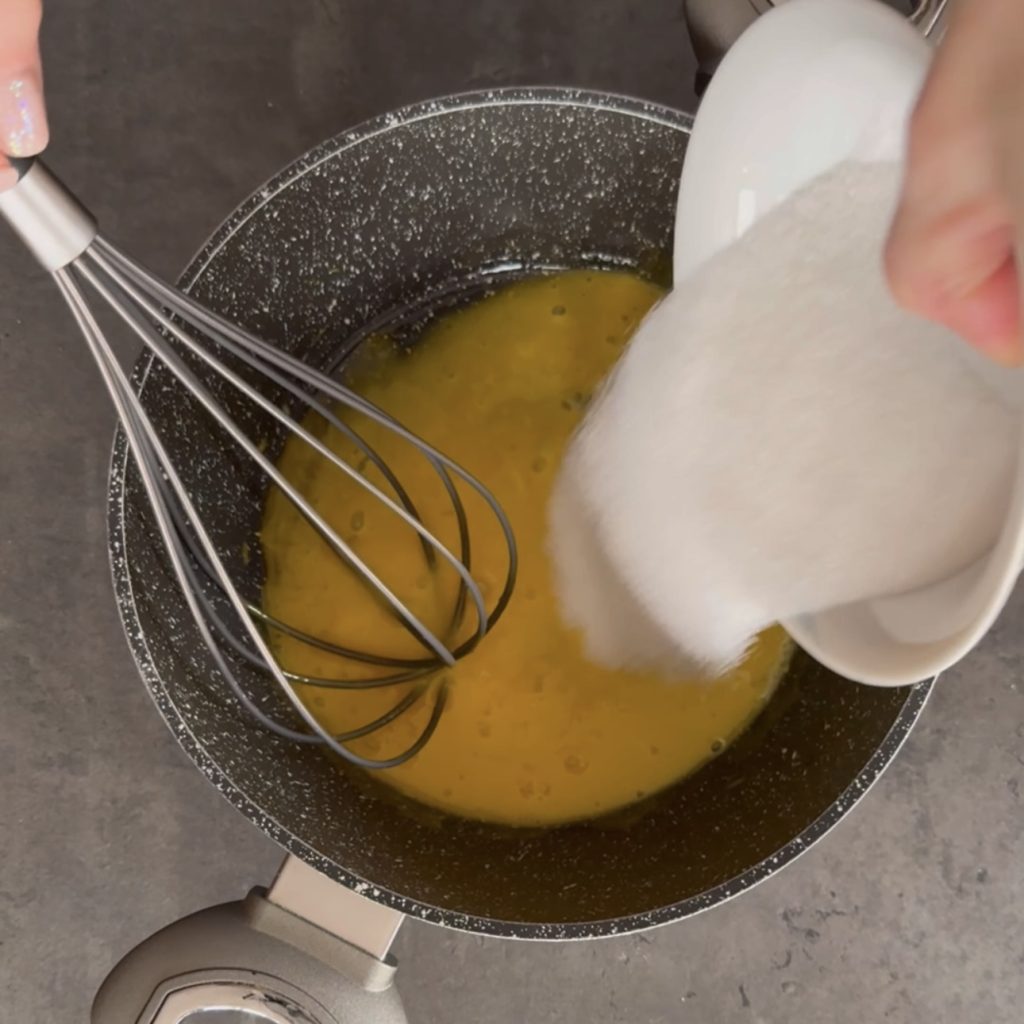 ajoutez également la fécule de maïs et incorporez-la aux œufs et au sucre pour obtenir une crème lisse et sans grumeaux.