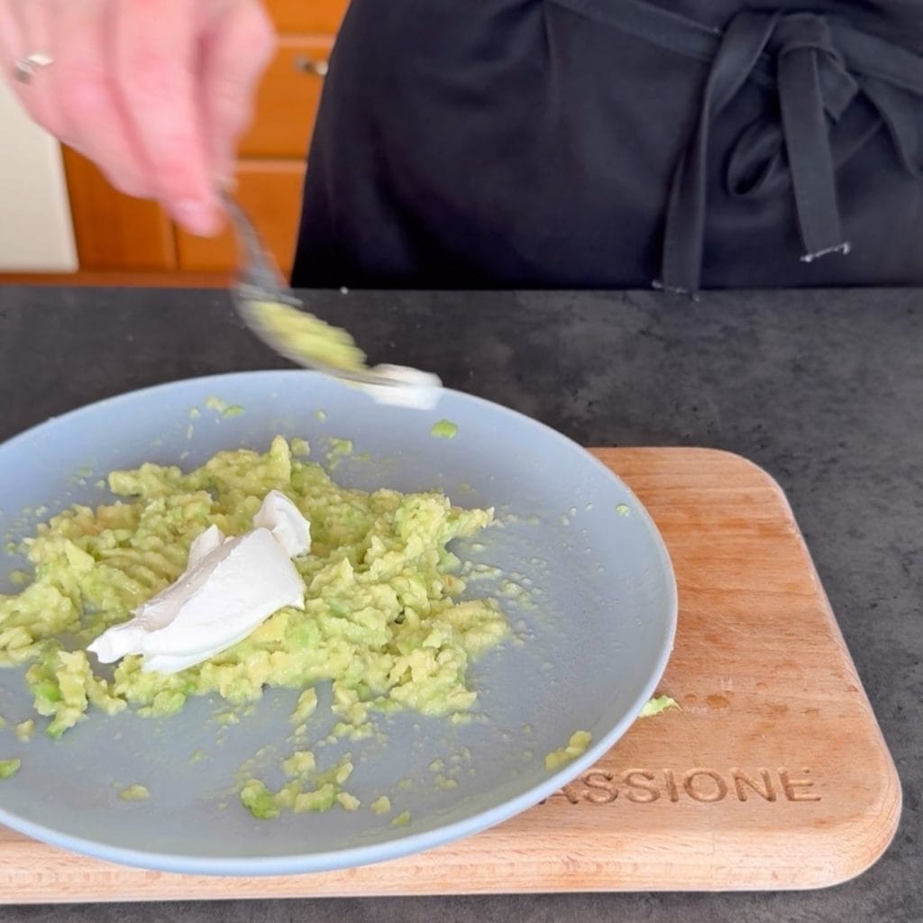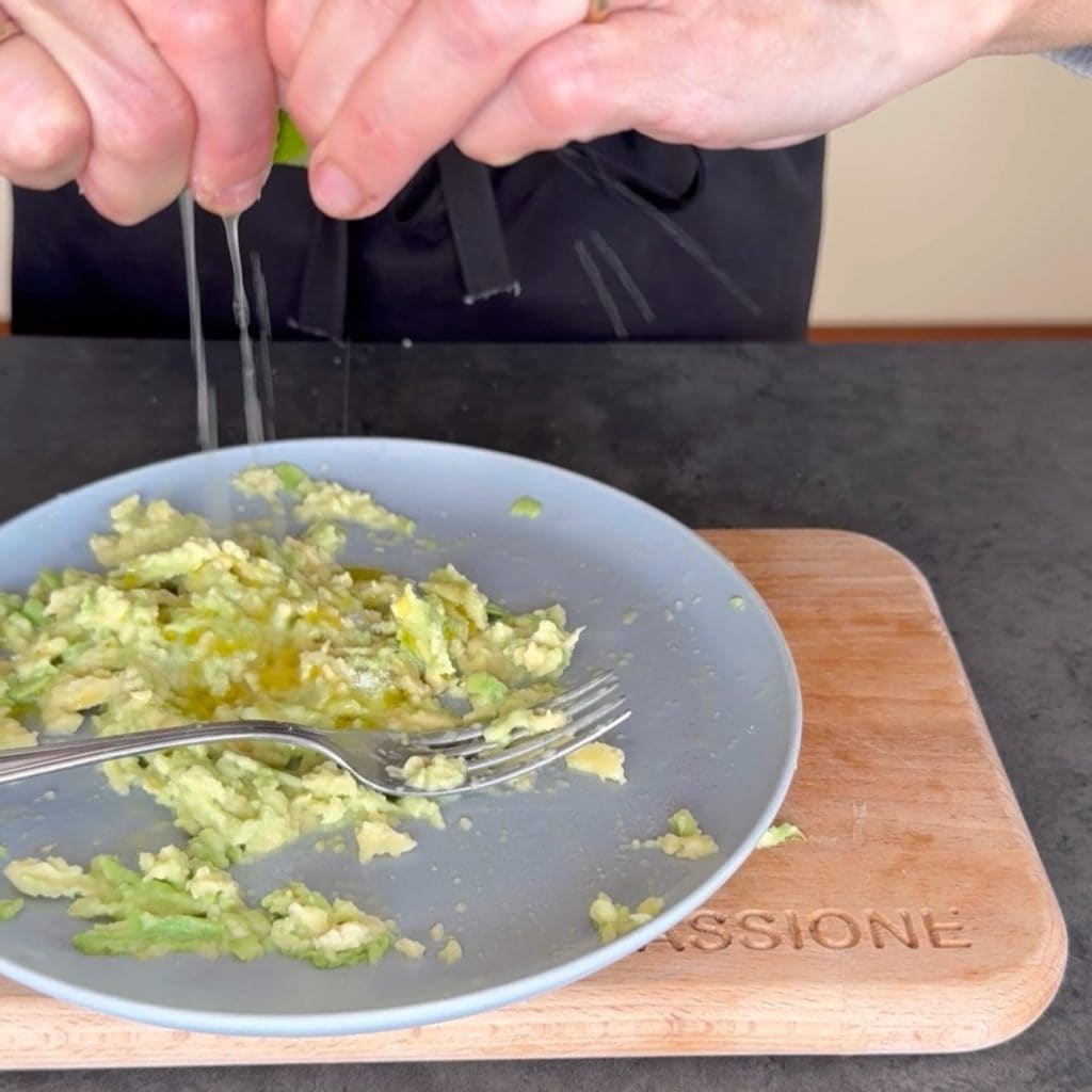 Écrasez la pulpe de l’avocat avec une fourchette pour en faire une crème,