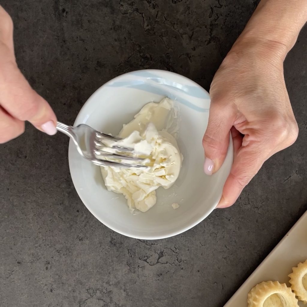 • Préparez maintenant la crème de garniture, versez le philadelphia dans un bol, travaillez-le avec une fourchette jusqu’à obtenir une crème lisse.