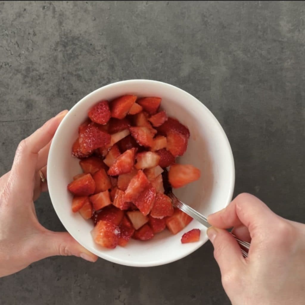 Prenez les fraises du frigo, versez dans un bol le jus de macération des fraises et gardez-le de côté. Ajoutez les morceaux de fraises à la crème et incorporez-les.