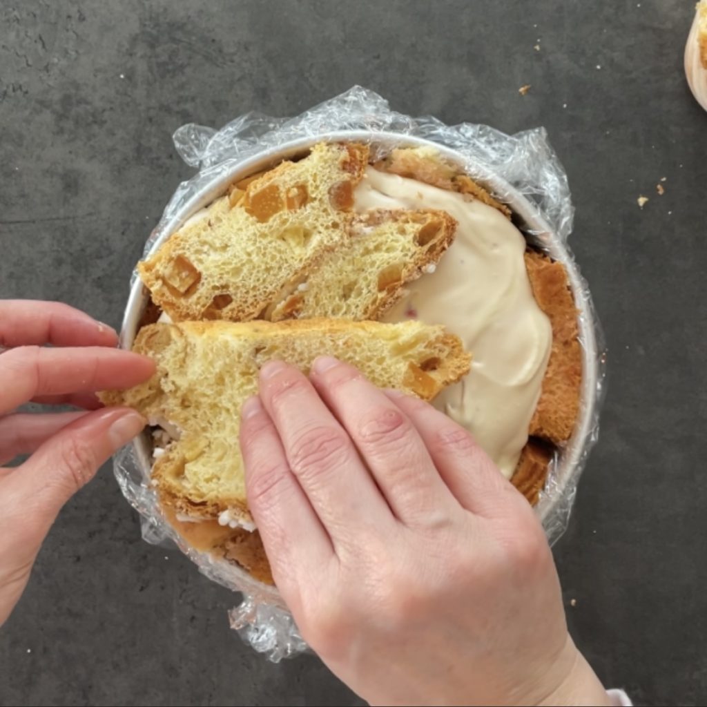 Tapissez le moule à zuccotto avec du film plastique et recouvrez-le de tranches de colombe.