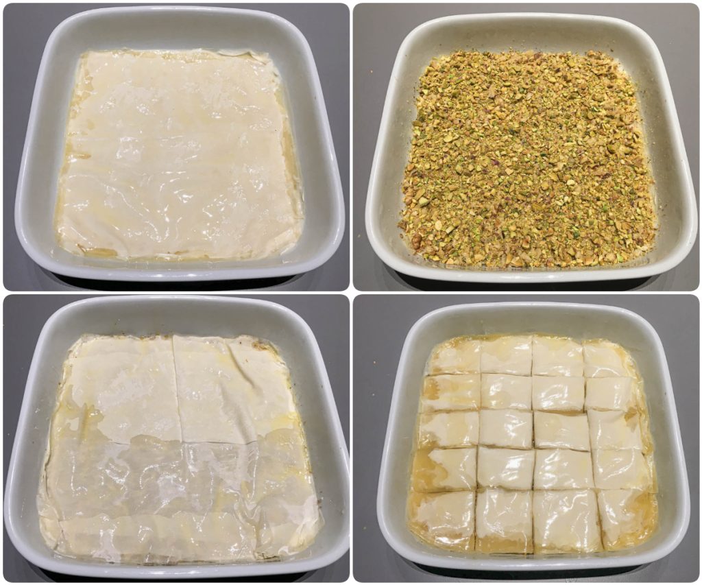 • Parsemez des noix et des pistaches hachées et faites d’autres couches de pâte filo comme précédemment.