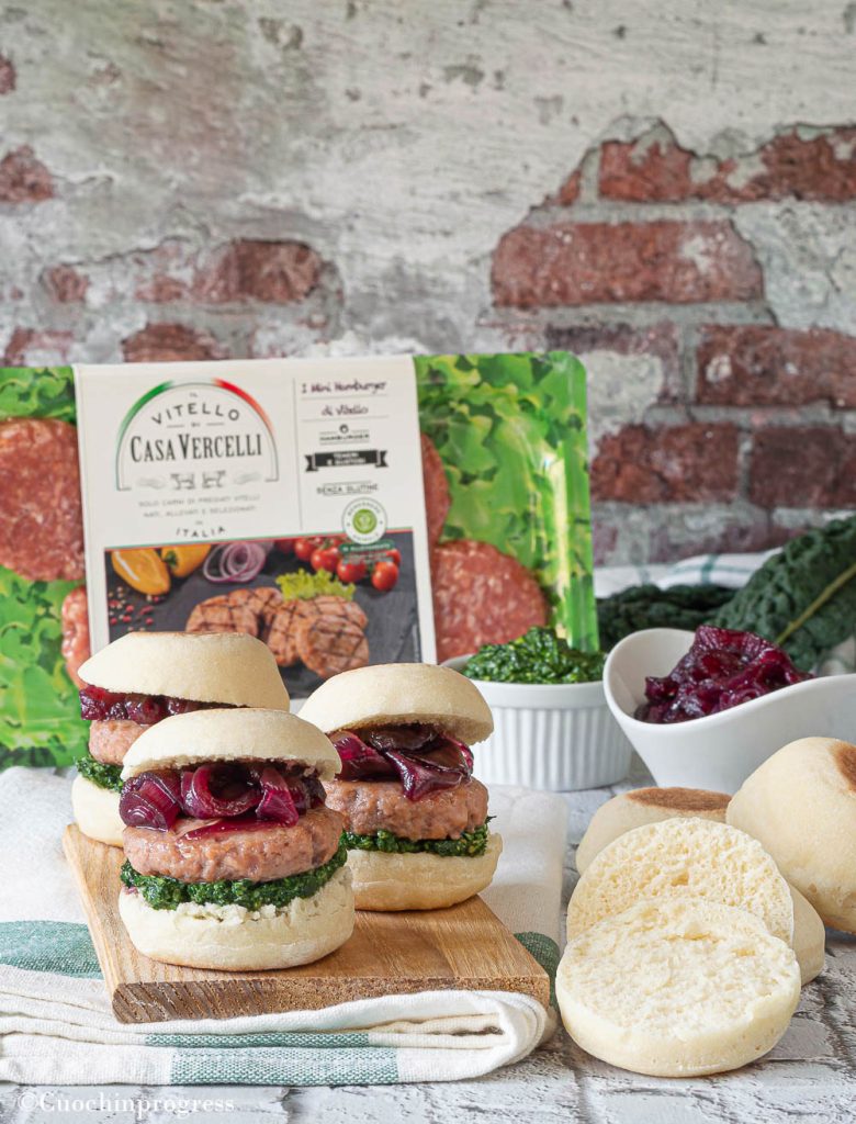 Coupez les batbout en deux, tartinez-les de pesto de chou kale, déposez les mini-hamburgers dessus et terminez par le confit d’oignons rouges.