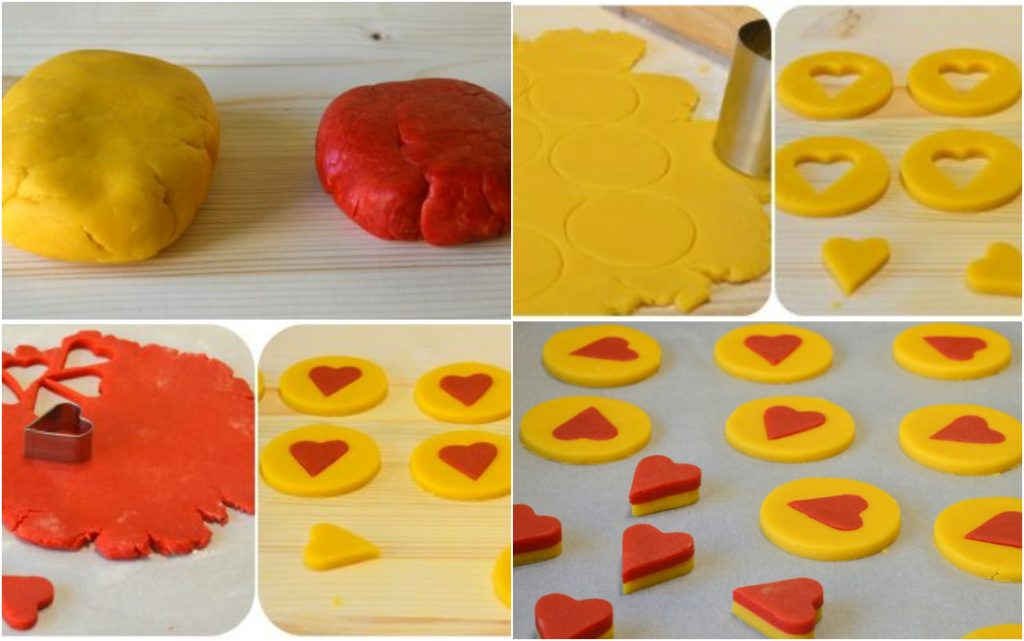• Continuez ainsi jusqu’à épuisement des pâtes, ou bien avec les petits cœurs blancs et rouges vous pouvez former d’autres biscuits en les superposant et en les collant entre eux avec un peu d’eau.