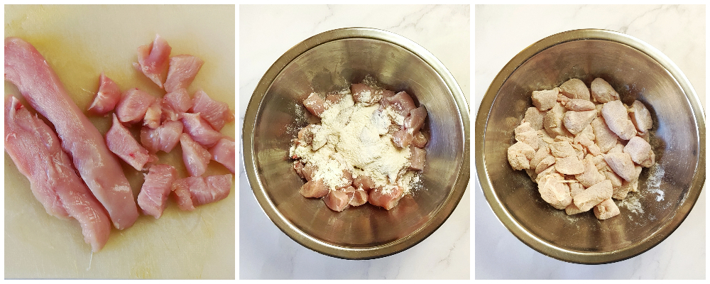 Retirez les éventuels morceaux de gras et petits os des blancs de poulet. Coupez-les ensuite en bouchées de taille à peu près égale et passez-les dans la farine.