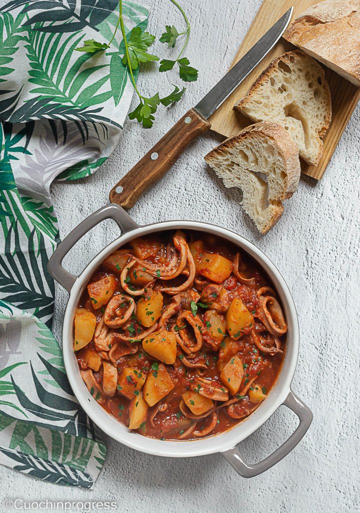 La qualité de ce plat tient surtout au contraste des textures : les calmars plus fermes (mais pas caoutchouteux si vous surveillez la cuisson) et les pommes de terre plus moelleuses et crémeuses, le tout nappé d’une succulente sauce tomate parfumée à l’ail et au persil, qui vous donnera immédiatement envie de saucer. Pour cette raison, même si les pommes de terre absorbent le jus, j’accompagne toujours le plat de quelques tranches de pain grillé…
