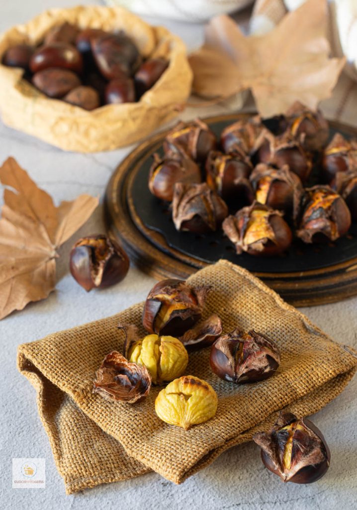 Lavez les châtaignes, séchez-les et pratiquez sur chacune une incision horizontale ou en croix sur la partie bombée, sans aller trop profondément (ainsi vous éviterez qu’elles n’éclatent pendant la cuisson).