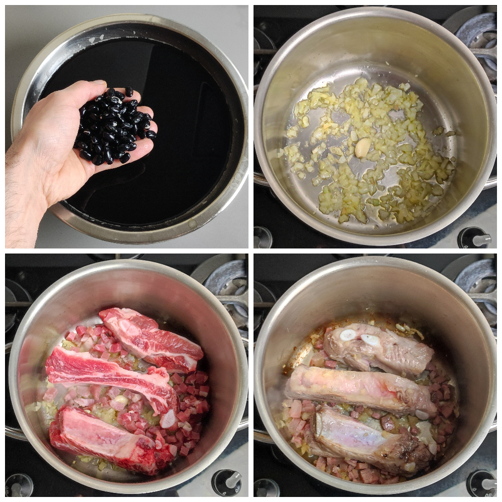 Dans une grande casserole, mettez l’huile et faites revenir l’oignon et l’ail. Ajoutez les côtes de porc, la poitrine coupée en dés et le morceau de jambon cru coupé en petits morceaux.