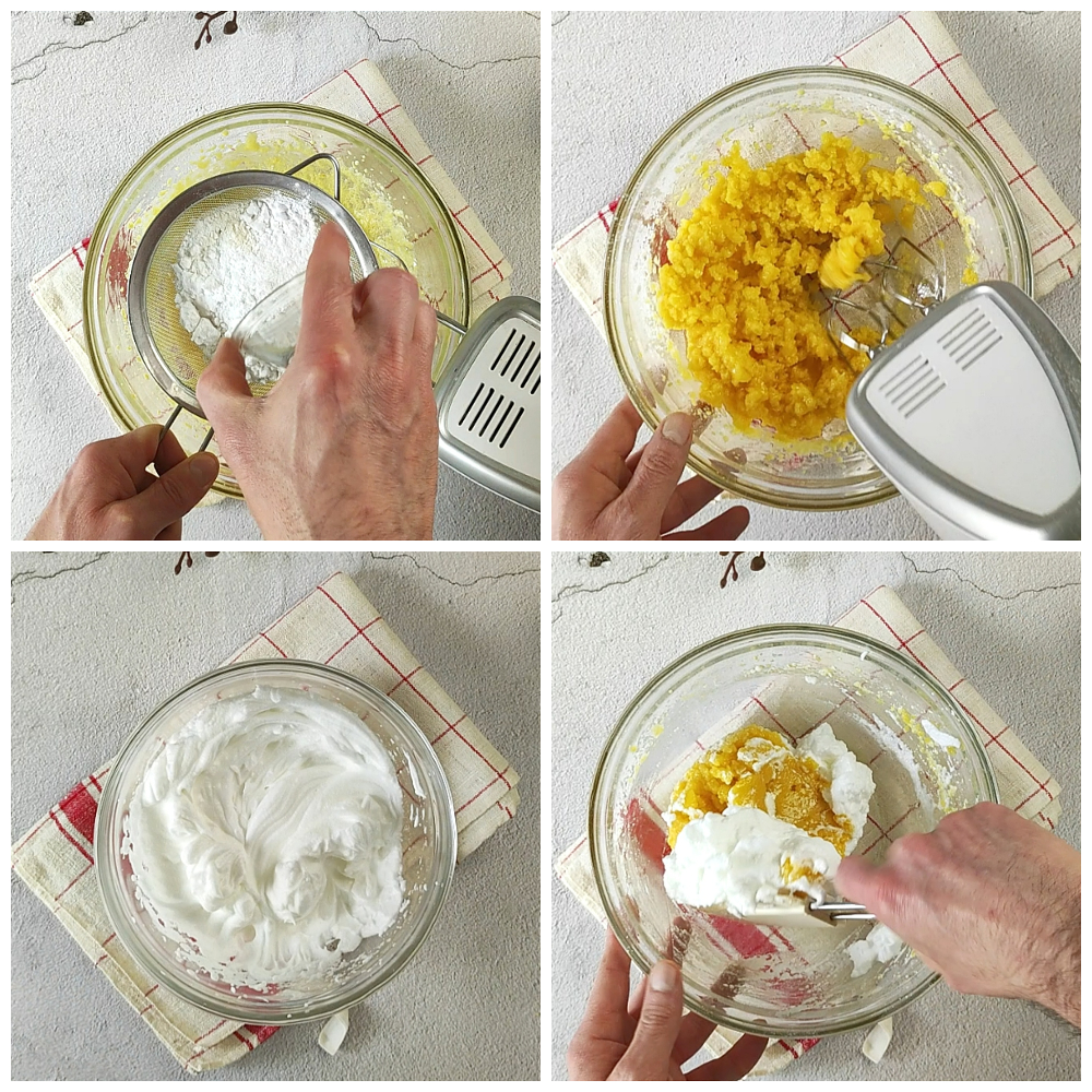 Séparez les jaunes des blancs. Travaillez les jaunes avec le sucre jusqu’à obtenir une crème claire et mousseuse. Ajoutez l’huile de tournesol et incorporez bien. Puis ajoutez le zeste de citron.