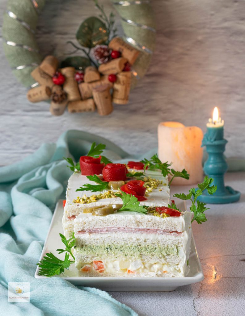 Pour compléter la composition, l’association classique et indémodable fromage et jambon cuit aux herbes, tendre et enveloppante, qui rend ce gâteau tramezzino équilibré et apprécié de tous.