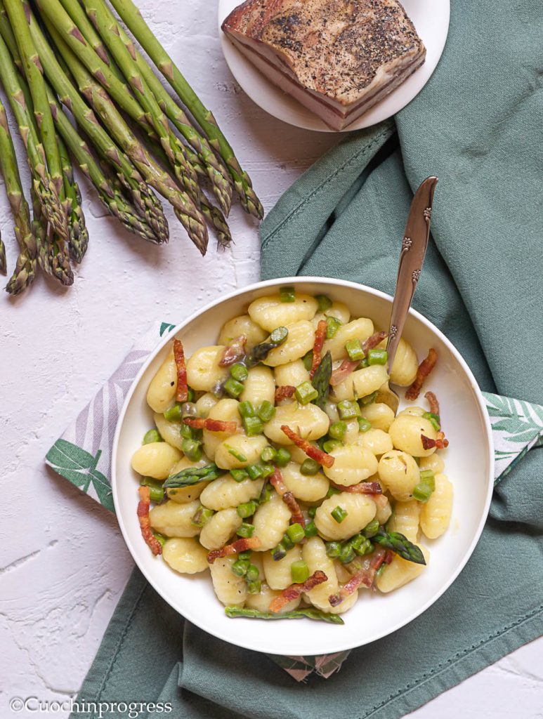 Les GNOCCHIS AUX ASPERGES ET AU GUANCIALE sont un premier plat savoureux et équilibré, parfait comme plat principal pour un déjeuner printanier, même lors d’une fête, quand on veut proposer quelque chose de gourmand et original. C’est une recette extrêmement facile à préparer, comme vous le verrez, mais qui mérite vraiment votre attention.