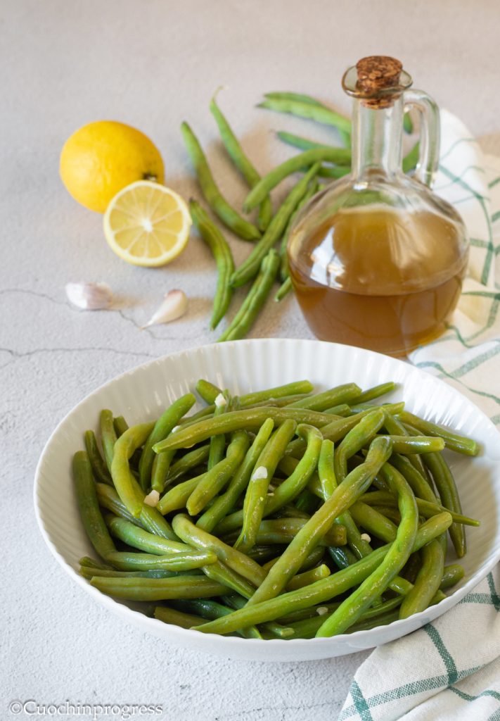 LES HARICOTS VERTS AU SEL, À L’HUILE ET AU CITRON sont un accompagnement simple, léger et savoureux, parfait pour accompagner des plats de viande ou de poisson. On les prépare en faisant cuire les haricots verts jusqu’à ce qu’ils soient tendres mais encore croquants, puis on les assaisonne d’un filet d’huile d’olive extra vierge, d’une pincée de sel et d’un trait de jus de citron, qui apporte de la fraîcheur et une agréable touche acidulée.